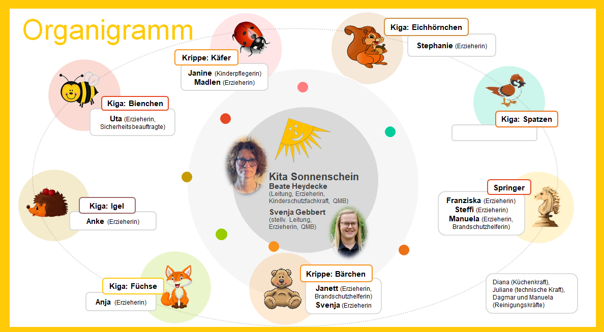 Der Einrichtungsalltag mit den Kindern wird von "uns" gestaltet. Im untenaufgeführten Organigramm stellen wir uns Ihnen mit unseren (Gruppen-) Verantwortlichkeiten vor: